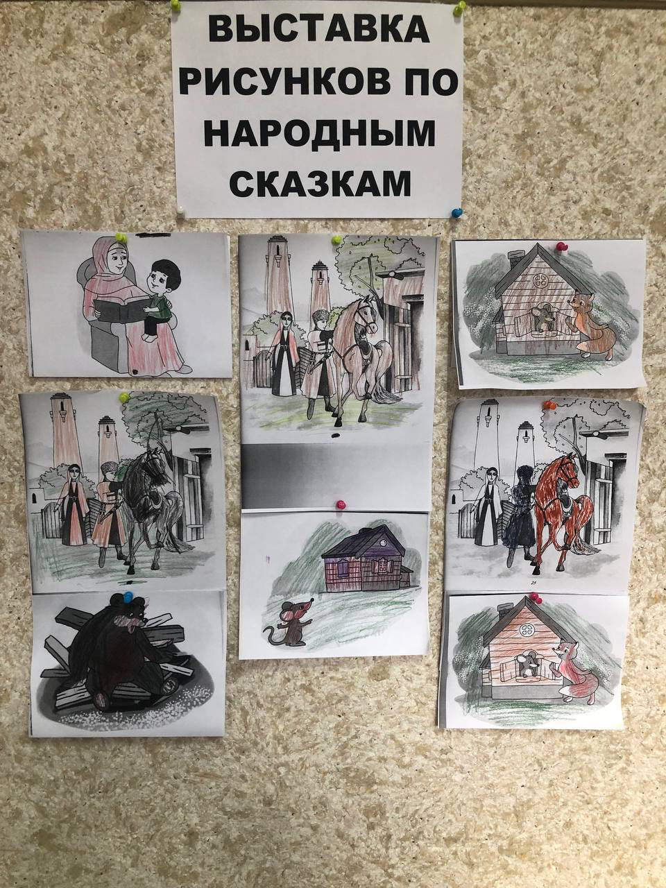 Проведение мероприятий, посвящённых Году чеченского языка в 2023 году. 10 октября провели выставку рисунков по народным сказкам.