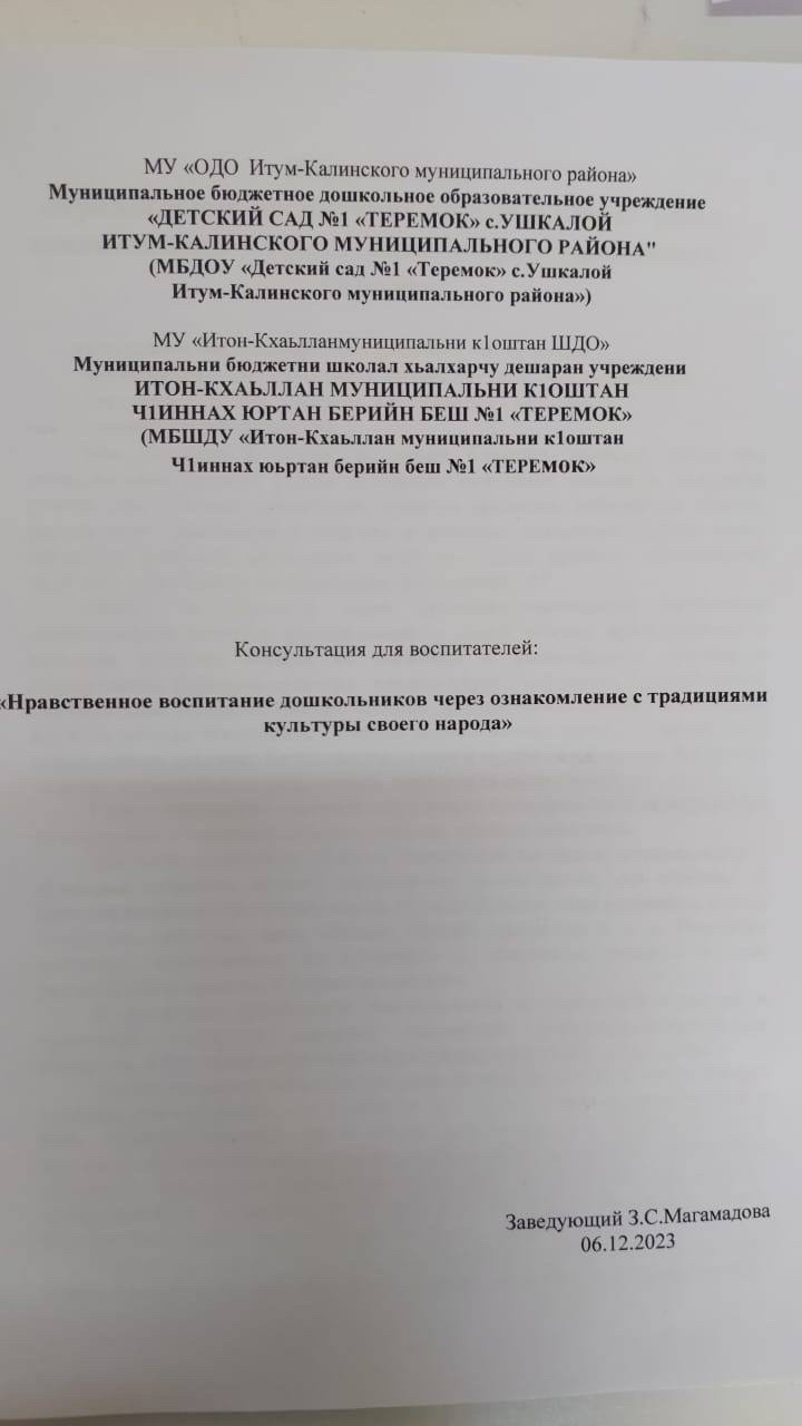 Проведение мероприятий, посвящённых Году чеченского языка в 2023 году. 6 декабря была проведена консультация для педагогов на тему: «Нравственное воспитание дошкольников через ознакомление с традициями культуры своего народа»